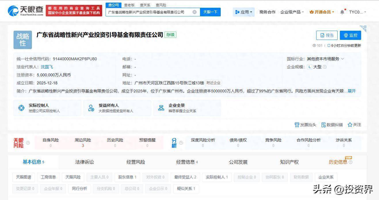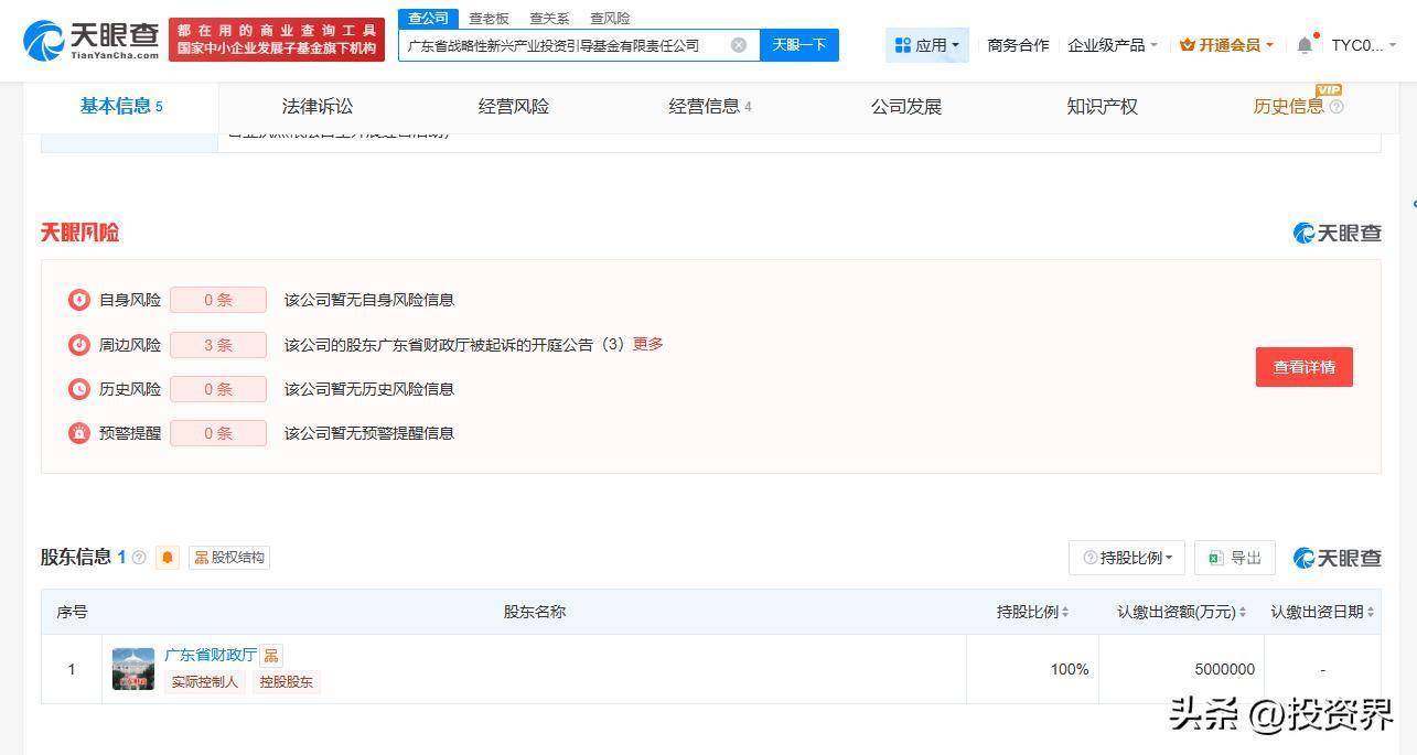投资界(ID:pedaily2012)12月22日消息,天眼查工商信息显示,近日赢翻网,广东省战略性新兴产业投资引导基金有限责任公司成立,法定代表人为沈国飞,注册资本500亿人民币,经营范围包括以私募基金从事股权投资、投资管理、资产管理等活动。股东信息显示,该公司由广东省财政厅全资持股。