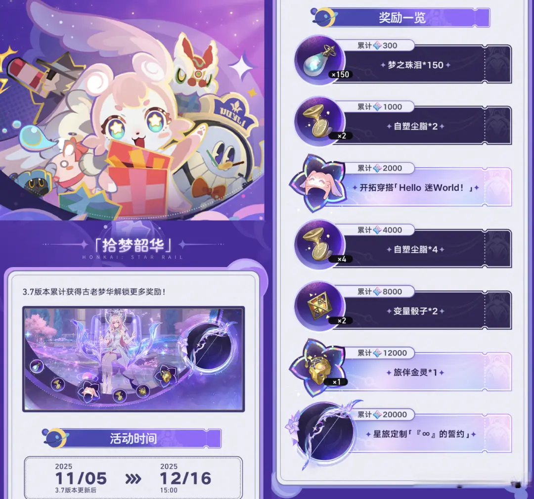 而在3.7版本除了活动福利外,商店也同步上新了超值礼包,累计获得古老梦华可解锁昔涟星旅定制皮肤等奖励,废话不多说,具体大家直接看下图。